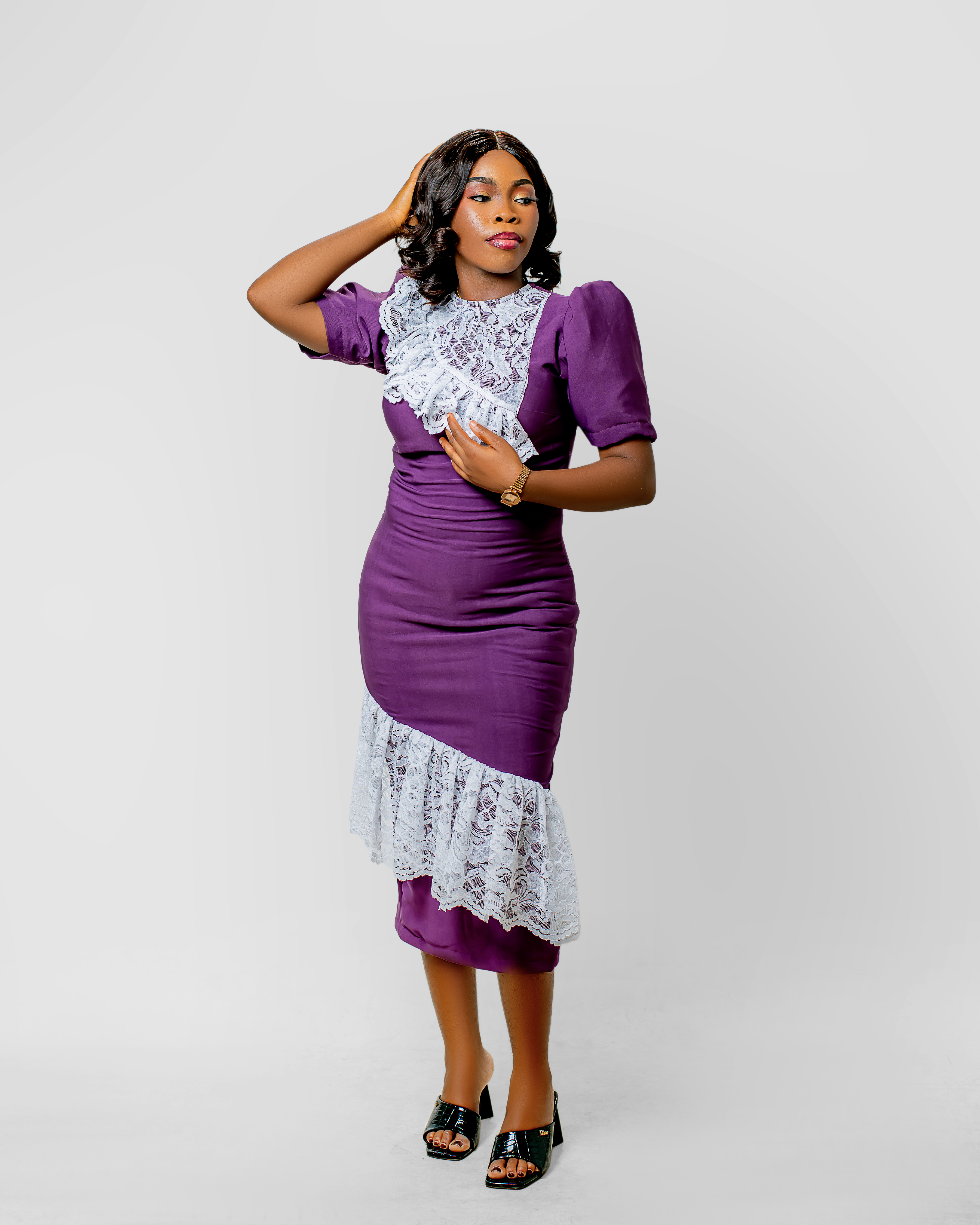 Exude timeless grace with our Plum & Lace Asymmetric Midi Dress. This stunning sheath dress combines a structured, form-fitting silhouette with delicate, contrasting lace ruffles. The rich purple tone serves as a regal backdrop for the intricate white lace detailing, creating a look that is perfect for weddings, cocktail parties, or upscale celebrations.