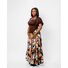- Style Tip: To let the intricate pattern shine, keep the bottom half of your outfit simple. Pair with white high-waisted trousers (as pictured) or a dark denim skinny jean. Complete the look with strappy black heels and minimal gold jewelry to complement the ochre tones in the fabric.