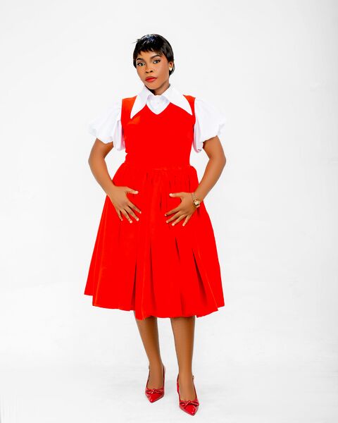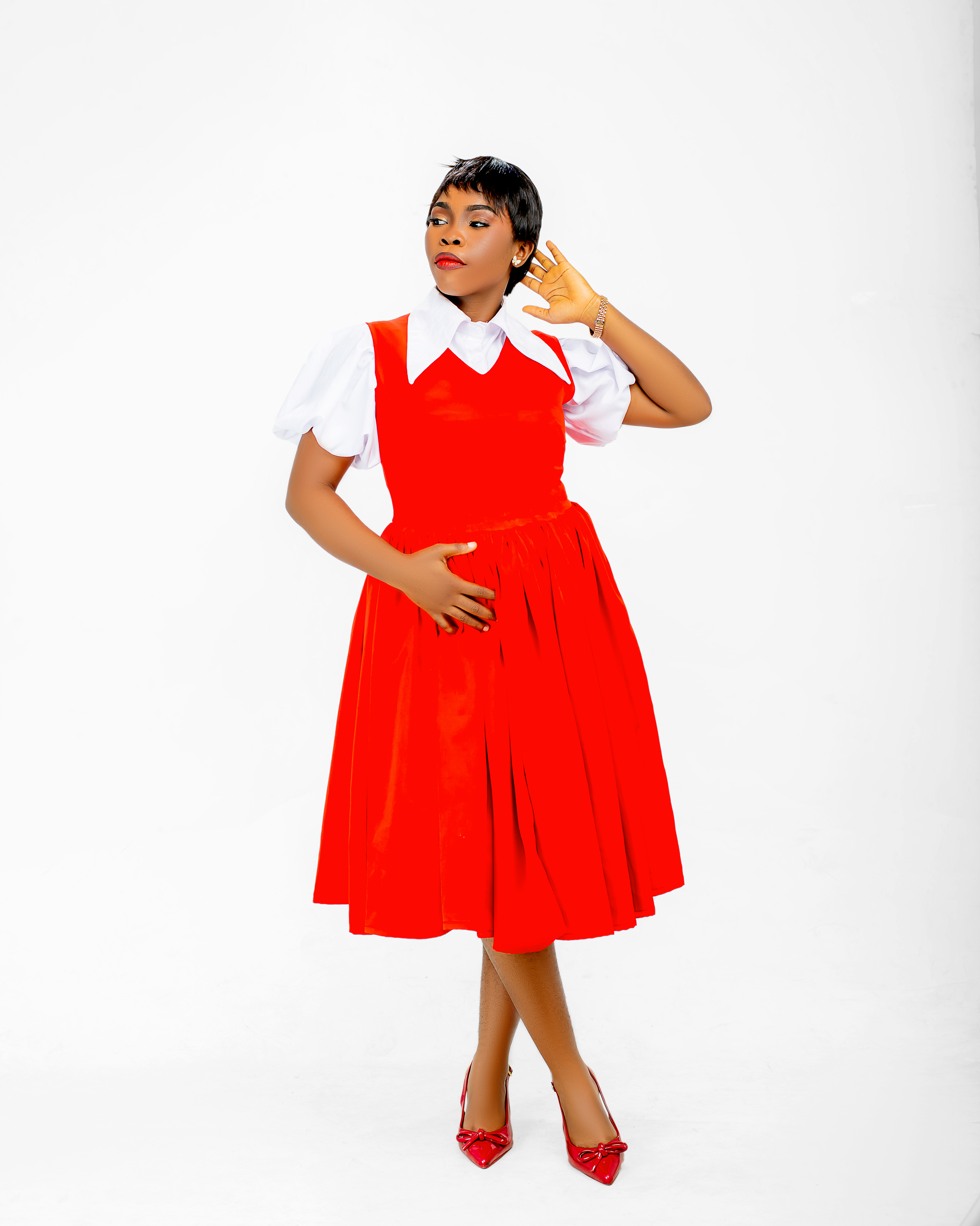 Step into timeless style with our Ruby Red Pinafore & Puff-Sleeve Blouse Set. This ensemble pairs a structured, vibrant red midi dress with a crisp white statement blouse. Designed with a nod to classic schoolgirl charm but elevated with contemporary proportions, this set offers a silhouette that is as flattering as it is spirited.